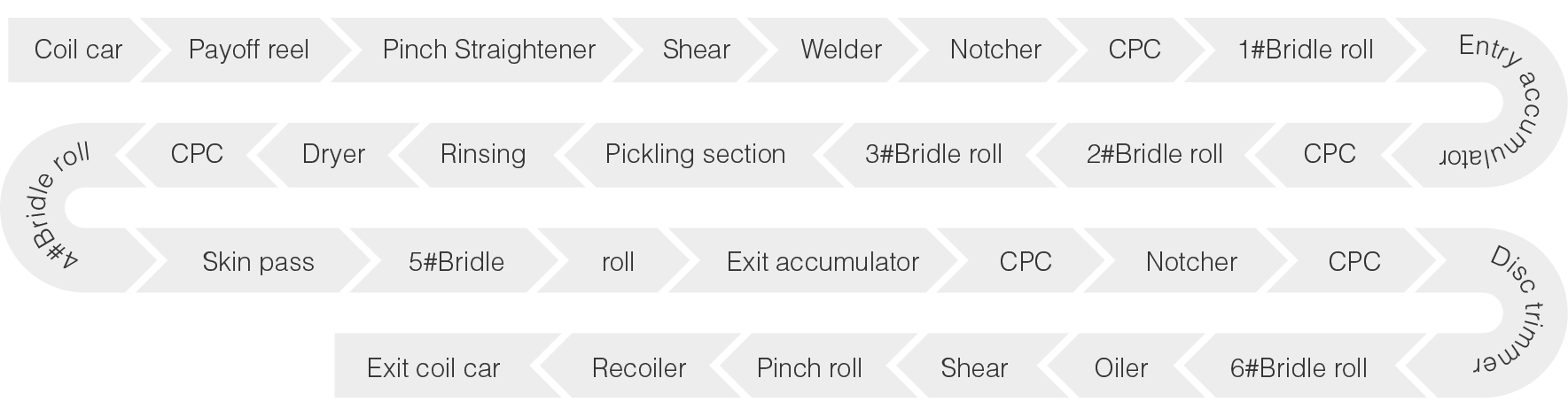 Push-pull Picking line has the characteristics of unsophisticated equipment, suitable for various strip steels, low consumption and few operation faults. This line has an annual capacity of 100,000-600,000tons.