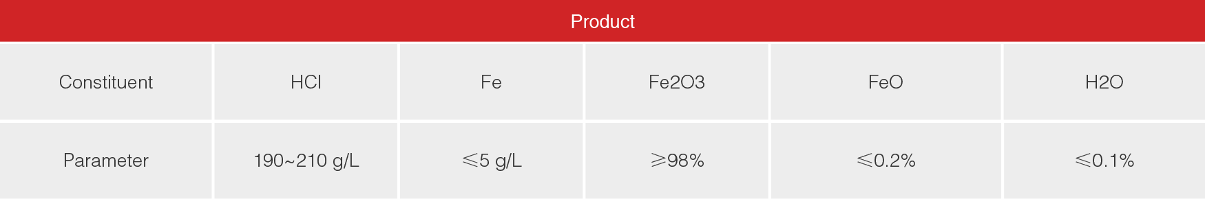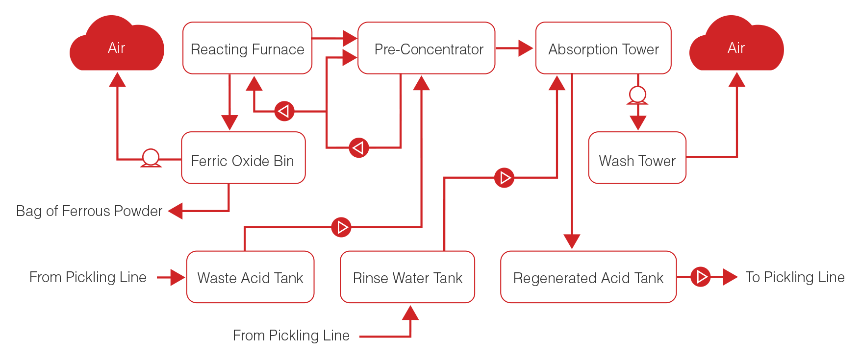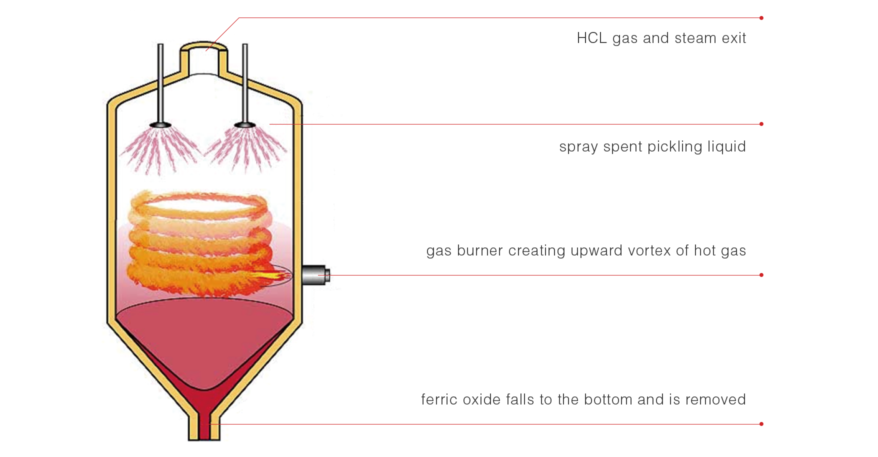 Spray Roasting Acid Regeneration technology is a mature process used in many systems worldwide. The principle is that the used acid reacts chemical with water and oxygen forming Fe2O3 and HCI under high temperature. The Silicon-removing device can be installed to improve the purity of Fe2O3. This system can recycle HCI above 90% and working together with picking unit will greatly lower HCI consumption and improve the pickling effort.